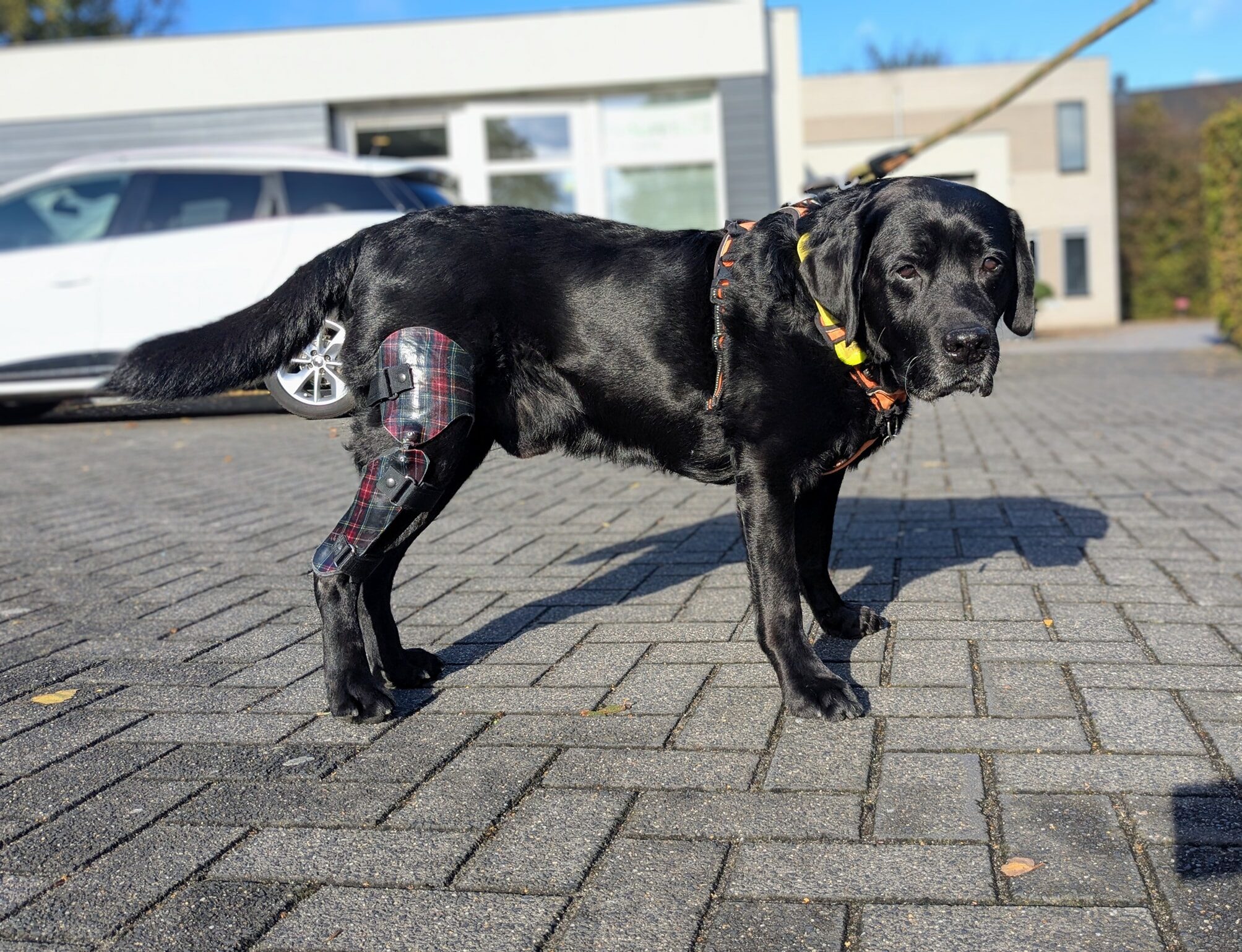 Flynt (de zwarte labrador) is een snel opa-tje van al 12 jaar. Als je Flynt ziet lopen, zal je nooit zijn leeftijd geschat hebben. Langzame wandelingen komen in zijn leven niet voor en, alsof hij geen tijd te verliezen heeft, hangt hij driftig vooraan zijn lijn om de wereld te ontdekken. Nu hij zijn brace heeft wordt zijn knie optimaal gesteund en hoeven de baasjes niet meer met kromme tenen toe te kijken bij zijn wilde ‘zoomies’.