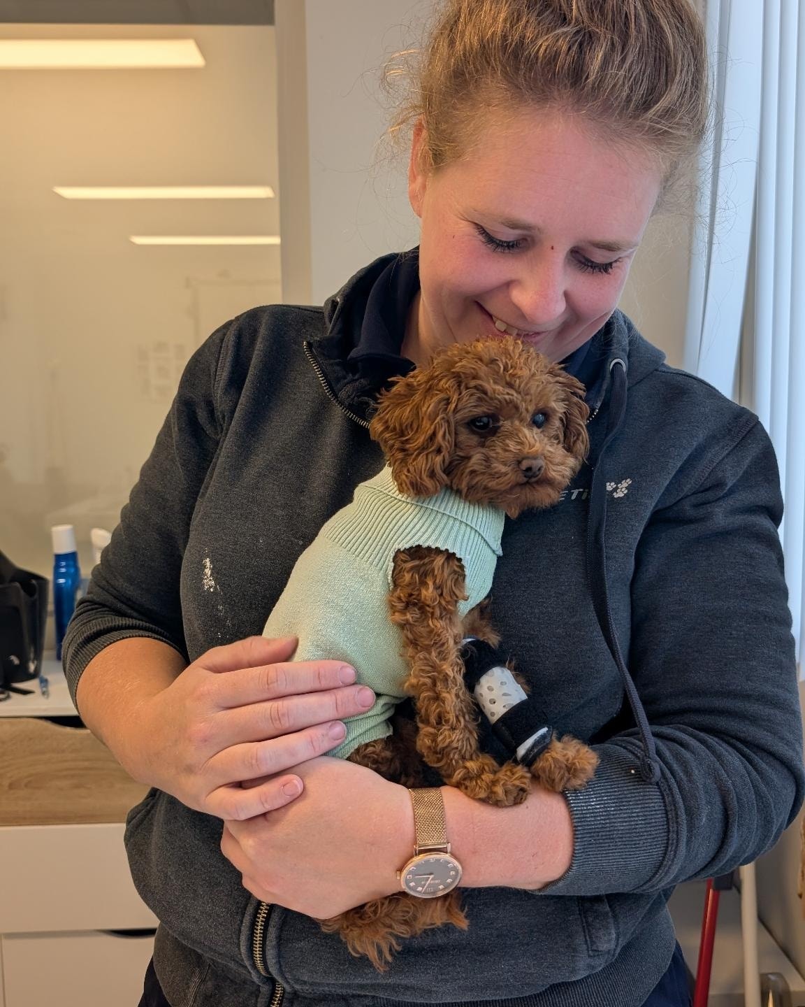 De baasjes zaten met hun handen in het haar en zochten een snelle oplossing om haar pootje goed te ondersteunen. Ter plekke heb ik een tijdelijk spalkje gemaakt waarbij wij hopen dat ze binnenkort haar pootje gaat belasten. In het gunstigste geval kunnen wij in de loop van tijd ook haar pootje steeds rechter corrigeren.