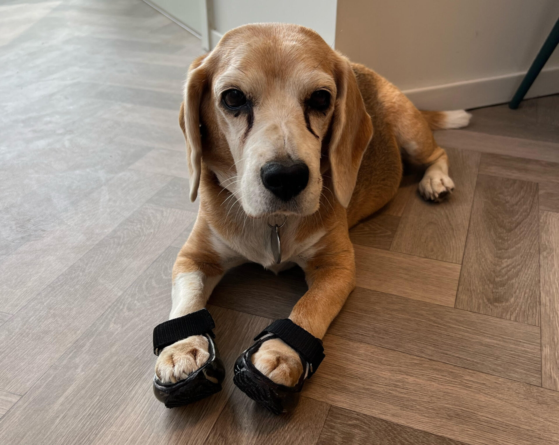 Zoë de Beagle heeft haar schoentjes opgehaald! denise Posted on 5 augustus 2022 Tagged with dierenorthopedie, hond brace, hond mank, orthopetics Zoë heeft haar schoenen opgehaald. Deze corrigeren en ontlasten haar voorpootjes. Ze deed het hartstikke goed!Haar maatje Babs hield alles goed in de gaten en was ook tevreden. Nu lekker gaan oefenen en daarna km’ers maken!!