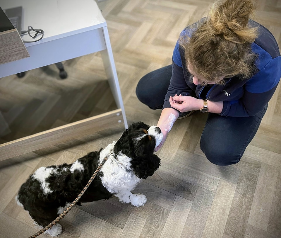 Een nieuwe operatie is risicovol voor Poemba en ook het herstelproces wilde de baasjes hem niet meer aandoen. Een kniebrace is hiervoor een perfect alternatief