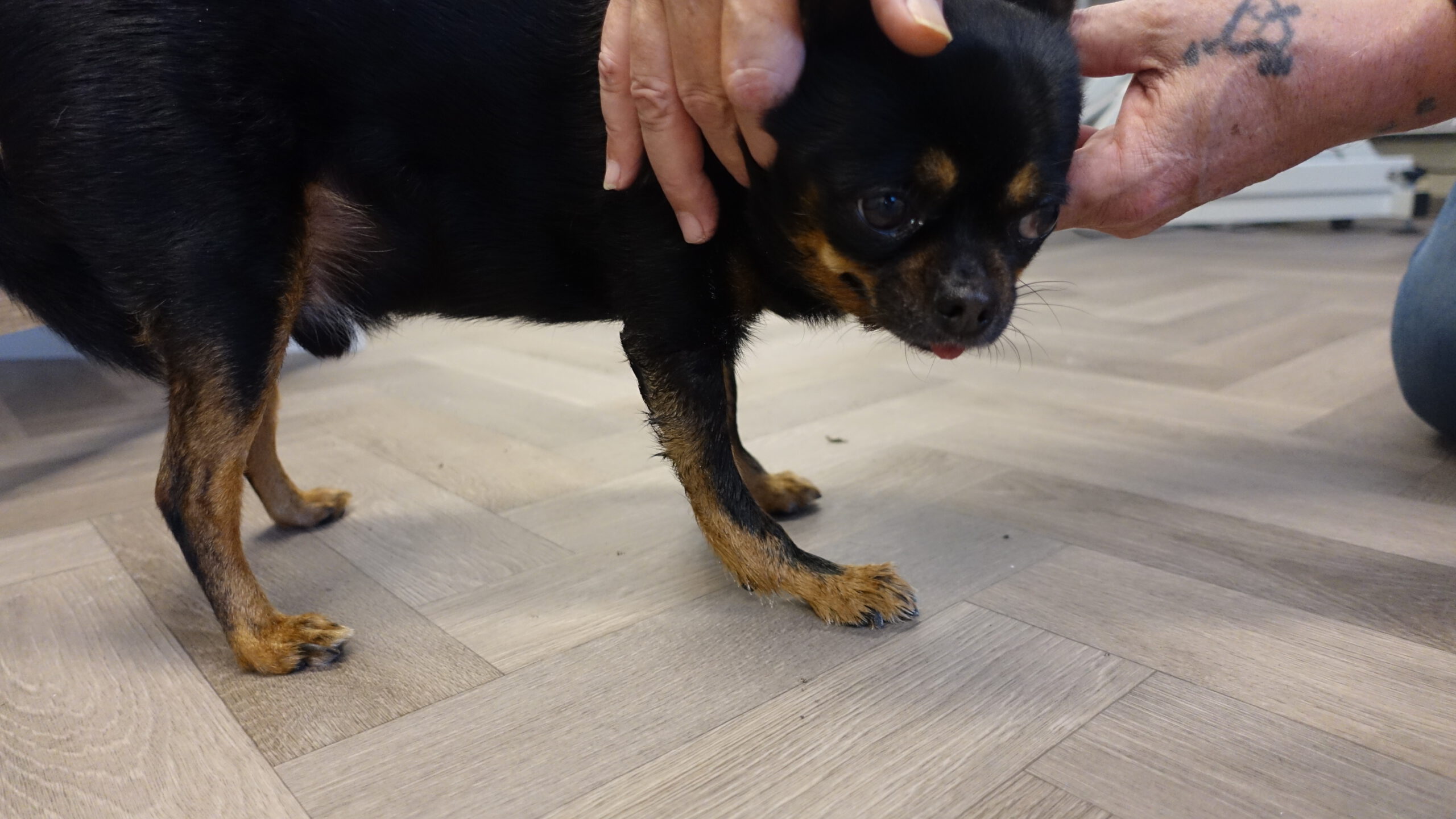 Bij Chicco ging het iets minder gemakkelijk. Deze oude man moest toch wel erg wennen aan zijn polsspalk. Maar, wat een verschil! Hij zakt nu niet meer door zijn pols, dat zal heel wat fijner lopen. Na een minuut of 5 legde hij zich erbij neer en begon er fier op te lopen.